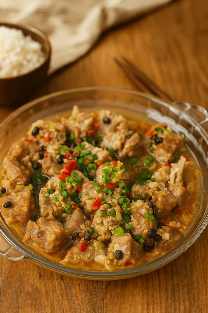 Main Ingredients: 300 g pork belly, thinly sliced 200 g green chilies (spiral or screw-shaped variety), cut into pieces Supporting Ingredients: 5 cloves garlic, sliced 10 g ginger, sliced 1 tbsp fermented black soybeans 20 g cooking oil Seasoning Ingredients: 1 tbsp cooking wine 2 tbsp soy sauce 1 tsp dark soy sauce 1 tbsp…