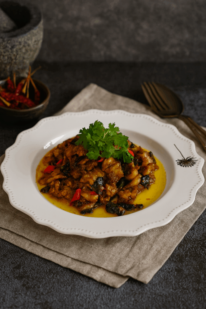 Main Ingredients: 300 g pork belly, thinly sliced Supporting Ingredients: 20 g curry leaves 2 bird’s eye chilies (optional) 30 g water Kam Heong Paste: 40 g dried shrimp, soaked until soft 40 g shallots 4 cloves garlic 1.5 tbsp oyster sauce 1/4 tsp salt 1.5 tbsp brown sugar 1.5 tbsp English curry powder 60…